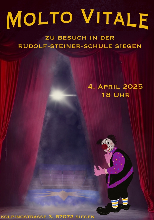 Molto Vitale ~ der Schulzirkus der  Emil Molt Schule Schule in Berlin (und Emil Molt war der Fabrikdirektor der Waldorf-Astoria, dem wir die Waldorf-Schule zu verdanken haben und der den „Seelenkalender“ in die Zigarettendosen stecken ließ) ~ beehrt die Siegener Rudolf Steiner Schule, wie schon öfter, mit einem Besuch. Am Ende des Tages mit viel Austausch zwischen den SchülerInnen gibt es eine öffentliche Aufführung! Freitag 4. April 2025, 18 Uhr!